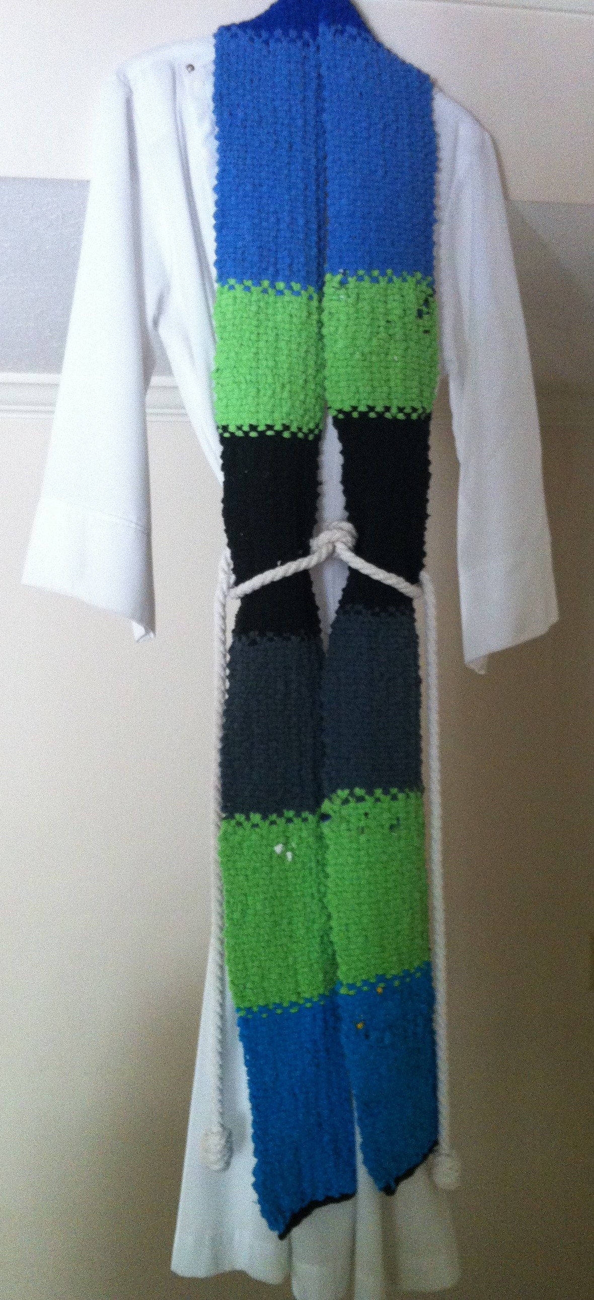 A good wash is necessary to get rid of all the little t-shirt specks that have accumulated on the stole, your clothes, floor, couch and cats while the knitting was in process. The stole will stretch on washing; shape it appropriately to dry. Embroider a cross on the seam if you wish.