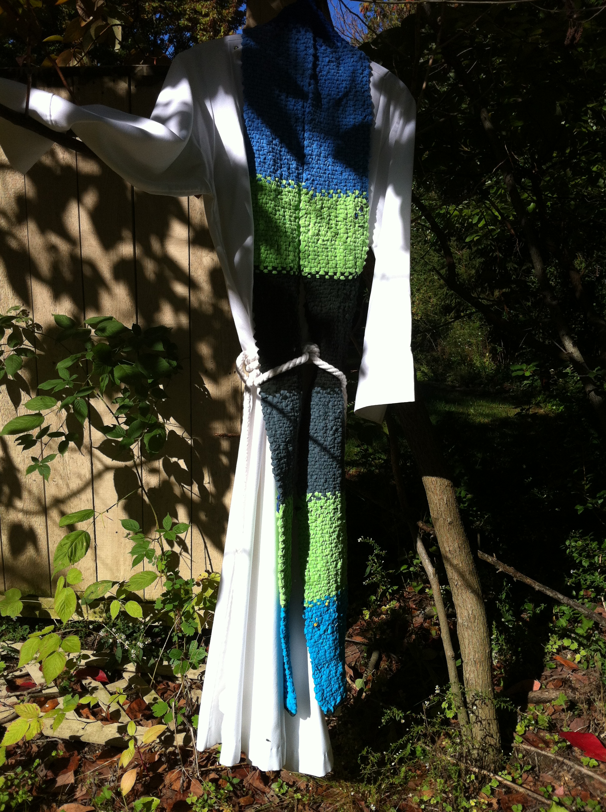 Recycling, knitting, and by no means least liturgy are some of my passions. Combining them into, er, unique liturgical wear has been a project which had me working with some great friends and some colourful plastic bags in the past (https://rosalindhughes.com/2011/06/17/a-plastic-story/) ; this time, it’s the humble t-shirt’s turn for a role in the artful worship of God.