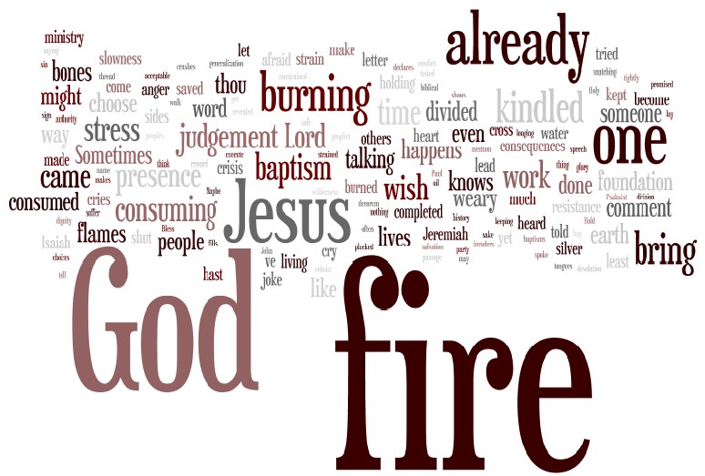 This entry was posted in image, lectionary reflection, sermon, sermon preparation and tagged 2 Chronicles 7:1, 2 Kings 2:11, Deuteronomy 4:24, Exodus 13:21, Exodus 3:2, fire, Jeremiah 20:9, Jeremiah 23:29, Luke 12:49-56, Psalm 66:8-12, word study, Year C Proper 15, Zechariah 3:2. Bookmark the permalink.