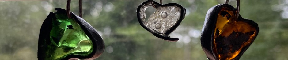 I’ve been working lately on incorporating beach glass into the things I make with my blacksmithing forge. There’s a whole other story about where the metal comes from and why I feel called to transform it into garden tools and crosses, but that’s for another time. The thing about the beach glass is that it has been shattered and scattered, rolled around, scoured and scrubbed, thrown up finally by the waves to settle among the rest of the silica sand.